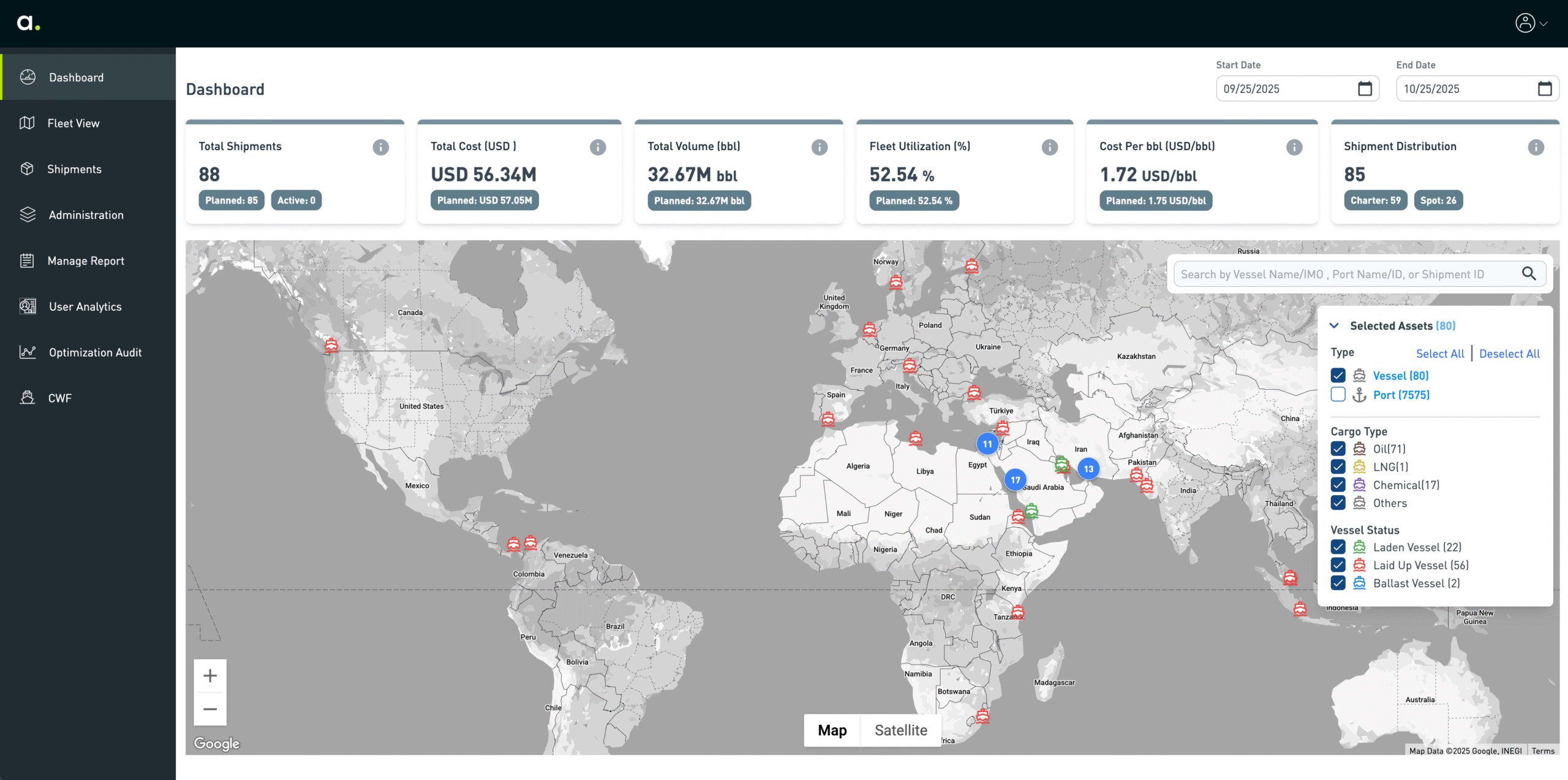The dashboard gives you a real-time, intelligent view of your transportation operations—tracking KPIs like cost, utilization, and efficiency, while an interactive global map delivers actionable insights to optimize routes and manage assets with confidence.